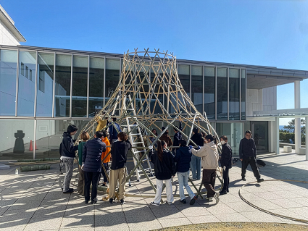 美術館の竹林から切り出した真竹を材料にして実施したビルディング・ワークショップでは、兼子ゼミの学生がサポートスタッフとなって活躍し、子どもを含む地域の方々との共同作業で、魚を入れる漁具の魚籠(びく)をイメージした巨大な構築物「巨魚籠(おおびく)」を見事に完成させました(写真1, 2)。
