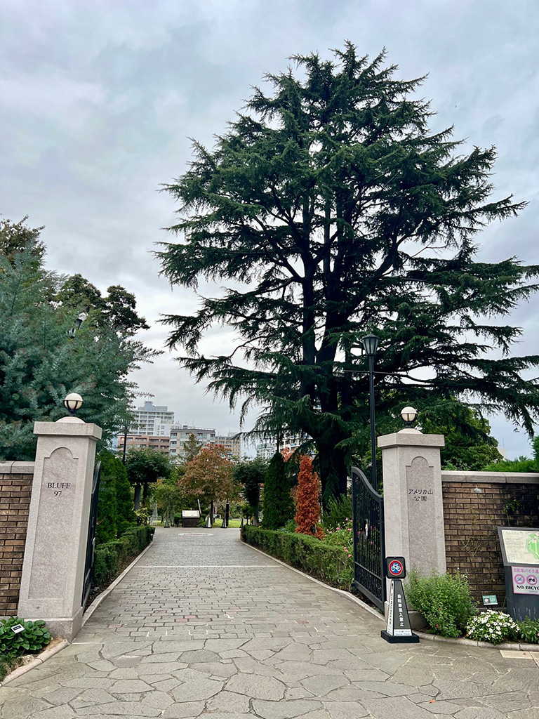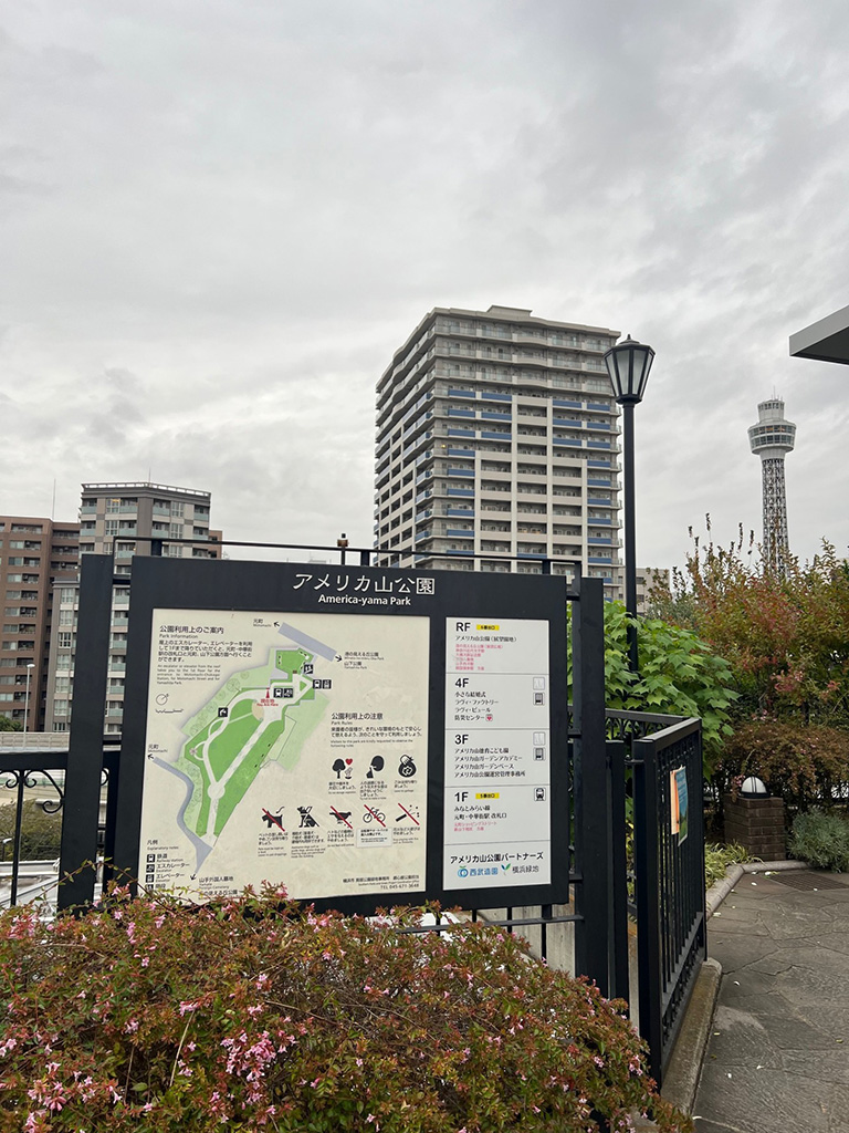 10月20日(月)に、昼休みと3時限のゼミナールの授業時間の2時間半に1回目の関内歩きを企画しました。まずは開講広場の日米和親条約締結の地のパネルを見ます。そしてすぐそばのアメリカ領事館跡地を探します。その後アメリカ山公園を目指します。この公園は、全国初の立体都市公園ということですが、ホームページには「明治初頭の米国公使館ゆかりの地であり、戦後は米軍の施設用地として利用されるなどアメリカと縁のある場所」と紹介されています。