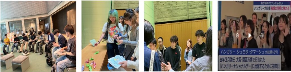 また、ある学生が「一番訪れてほしいところはどこですか」という質問には、間髪を入れずに「原爆資料館です」とお話しされた。学生たちは平和への祈りをこめて鶴を折り、語り部の方からお話しを聞くこともできました。さらにこの日はハンガリー大統領を歓迎することもでき、その様子は長崎の放送局にも放映されました。
